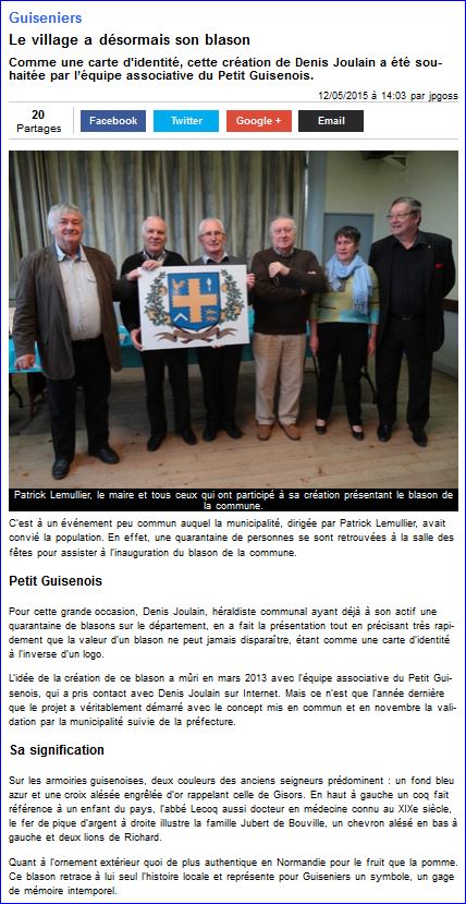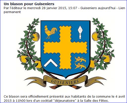 (2014) D'azur à la croix alésée et engrêlée d'or cantonnée au 1er d'un coq du même, au 2e d'un fer de pique d'argent, au 3e d'un chevron alésé du même, au 4e de deux léopards d'or l'un au-dessus de l'autre.