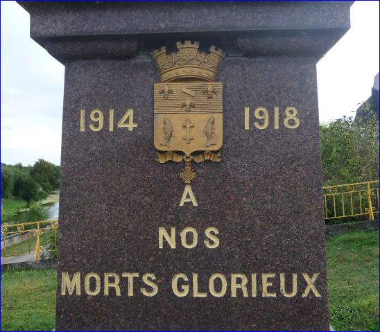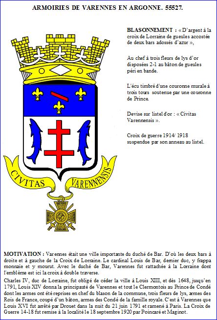 D'argent à la croix de Lorraine de gueules accostée de deux bars adossés d'azur; au chef du même chargé de trois fleurs de lis d'or ordonnées 2 et 1 et au bâton de gueules péri en bande.