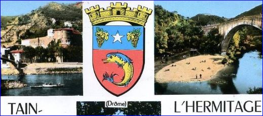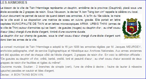 (1938) De gueules au dauphin d'or, barbé, crêté, lorré, oreillé et peautré d'azur; au chef cousu du même chargé d'une étoile d'argent accostée de deux grappes de raisin tigées et feuillées d'or.