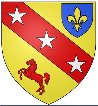 D'or à la bande de gueules chargée de trois étoiles d'argent, accompagnée en chef d'un écu d'azur chargé d'une fleur de lis d'or et en pointe d'un cheval cabré de gueules.