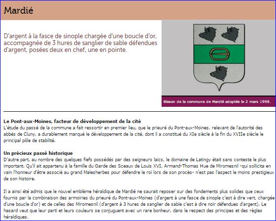 (1998) D'argent à la fasce de sinople chargée d'un fermail d'or, accompagnée de trois hures de sanglier de sable défendues du champ.
