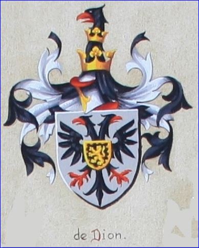 Parti: au 1er d'argent à l'aigle bicéphale de sable, becquée et membrée de gueules, chargée sur sa poitrine d'un écusson d'or, au 2e de sable à la bande d'or accompagnée en chef d'une étoile et d'une rose et en pointe d'une rose et d'une étoile, le tout d'argent.