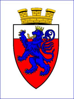 De gueules au chef d'argent; au lion d'azur, brochant sur le tout.