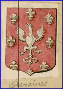 (XVIe s.) De gueules à l'aigle d'argent accompagnée de huit fleurs de lis d'or ordonnées en orle.