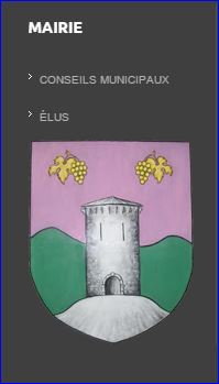 Coupé ondé de pourpre et de sinople, à la tour ronde couverte d'argent, posée sur un mont du même, ajourée et maçonnée de sable, brochant sur le tout et surmontée de deux grappes de raisins feuillées d'or.