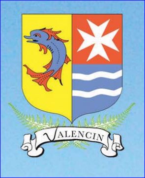 Parti: au 1er d'or au dauphin d'azur barbé, crêté, oreillé, peautré et lorré de gueules, au 2e coupé au I de gueules à la croix de Malte d'argent, au II d'azur à deux fasces ondées d'argent.