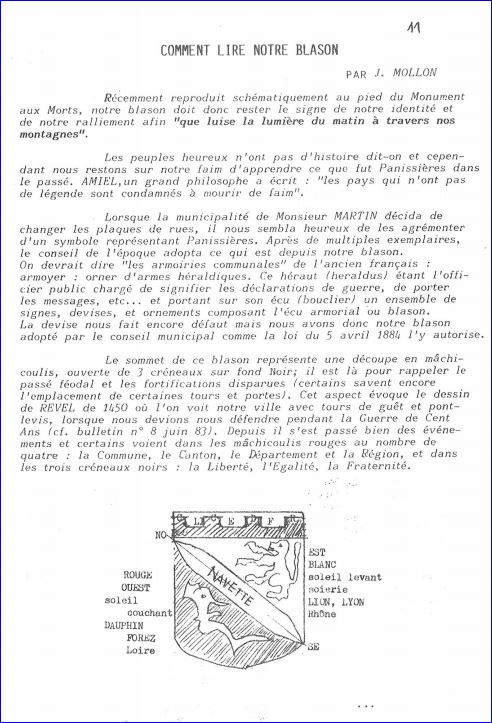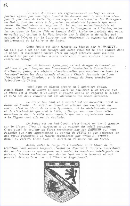 Tranché: au 1er d'argent au lion de gueules, au 2e de gueules au dauphin contourné d'or; à la navette de sable, remplie d'argent et brochant en bande sur la partition; le tout sommé d'un chef crénelé de quatre merlons de gueules, maçonné de sable, les créneaux ajourés du même.