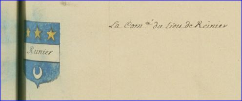 D'azur à la fasce d'argent chargée de l'inscription de sable « REYNIER », accompagnée en chef d'une étoile d'or accostée de deux autres étoiles d'argent et en pointe de deux croissants du même rangés en fasce.