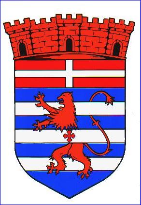 (1991) D'azur à trois fasces d'argent, celle du milieu chargée en cœur d'une croisette tréflée de gueules, au lion d'or entravaillé sous la deuxième fasce qu'il broche de sa patte antérieure senestre, brochant sur les deux autres, la queue léopardée passant sur la deuxième fasce et sous la première, puis s'arrondissant sur elle; au chef de gueules à la croix d'argent.