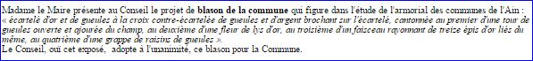 (2012) Écartelé d'or et de gueules à la croix contre-écartelée de gueules et d'argent brochant sur l'écartelé, cantonnée au 1er d'une tour de gueules ouverte et ajourée du champ, au 2e d'une fleur de lis d'or, au 3e d'un faisceau rayonnant de treize épis d'or empoigné et lié du même, au 4e d'une grappe de raisin de gueules.