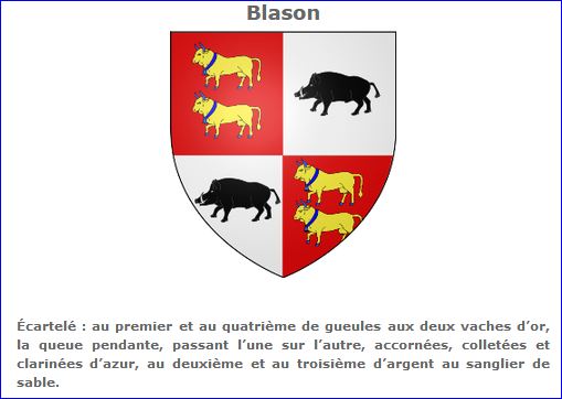 Écartelé: aux 1er et 4e de gueules à deux vaches, la queue pendante, d'or, accornées, colletées et clarinées d'azur, passant l'une au-dessus de l'autre, aux 2e et 3e d'argent au sanglier de sable.