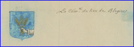 D'azur au dextrochère de carnation, vêtu d'argent, mouvant du flanc senestre et empoignant trois épis de blé tigés et feuillés d'or.