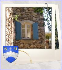 D'azur au pont antique d'une arche d'argent, maçonné de sable, sommé d'une croix latine d'argent, et surmonté des lettres capitales S et M d'or.