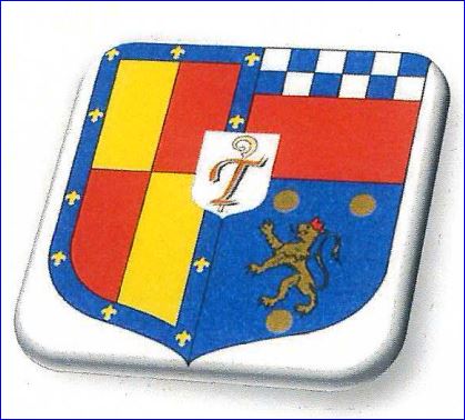 Parti: au 1er écartelé d'or et de gueules, à la bordure d'azur chargée de dix fleurs de lis d'or, au 2e coupé au I de gueules plain au chef échiqueté d'argent et d'azur de deux tires, au II d'azur au lion d'or, armé, lampassé et couronné de gueules, accompagné de trois besants d'or; sur le tout, d'argent à la lettre T d'or brochant sur une crosse du même.