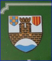 (1998) D'argent au pont d'une arche, fortifié d'une tour, le tout de sable, ajouré du champ et maçonné d'or, franchissant une rivière d'azur mouvant de la pointe, accompagné en chef, à dextre, d'un écusson à cinq points d'or équipollés à quatre points d'azur et, à senestre, d'un écusson palé d'or et de gueules.