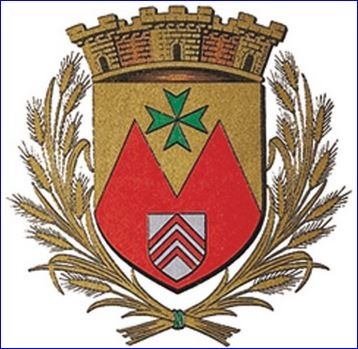 (1966) Coupé émanché de deux pointes: au 1er d'or à la croix de saint Lazare de sinople, au 2e de gueules à l'écusson d'argent à trois chevrons de gueules.