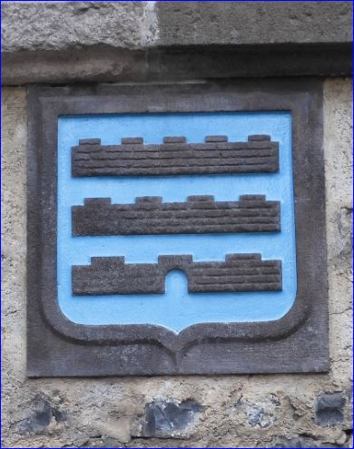 (1978) D'azur à trois fasces alésées d'argent, maçonnées de sable, crénelées respectivement de cinq, quatre et trois pièces, celle de la pointe ouverte du champ.