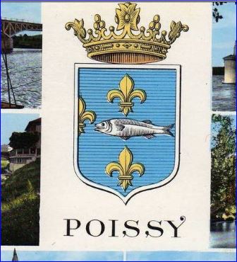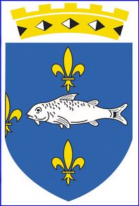 (1276, XIVe s.) D'azur au poisson d'argent posé en fasce, accompagné d'une fleur de lis d'or en chef, d'une en pointe et d'une autre mouvant à demi du flanc dextre.