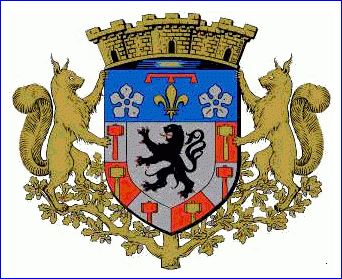 (1961) D'argent au lion de sable, armé et lampassé de gueules, à la bordure componée d'argent et de gueules, chaque compon chargé d'un maillet de gueules sur l'argent et d'or sur le gueules ; au chef d'azur chargé d'une fleur de lis d'or accostée de deux quintefeuilles d'argent et surmontée d'un lambel de gueules, brochant sur la bordure.