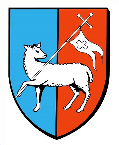Parti d'azur et de gueules; à l'agneau pascal d'argent, la tête contournée, brochant sur le tout.