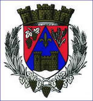 D'azur au château à deux tours d'or, maçonné de sable, posé sur une champagne ondée d'argent et surmonté d'une fleur de lis d'or; le tout chapé cousu de gueules, au pampre d'argent fruité de deux pièces d'or à dextre et à trois épis empoignés du même, tigés et feuillés d'argent à senestre.
