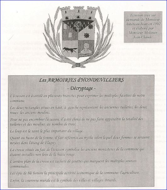 (1992) Écartelé: au 1er de gueules à deux billettes d'argent rangées en bande, au 2e d'or à deux roues de moulin de sable rangées en barre, au 3e d'or au loup passant de sable, au 4e de gueules au buste de femme d'argent mouvent d'une jumelle ondée d'or: le tout sommé d'un chef triangulaire d'azur semé de larmes d'argent et à la crosse contournée d'or, remplie de sable et mouvant de la pointe du chef