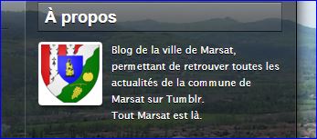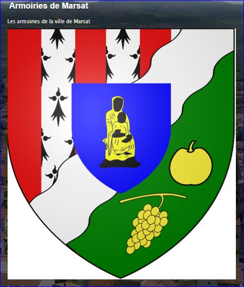 (1939) Taillé: au 1er de gueules à trois pals d'hermine, au 2e de sinople à la pomme d'or soutenue d'une grappe de raisin du même, à la barre ondée d'argent brochant sur la partition; sur le tout d'azur à Notre Dame à l'Enfant de Marsat de sable, vêtue d'or.