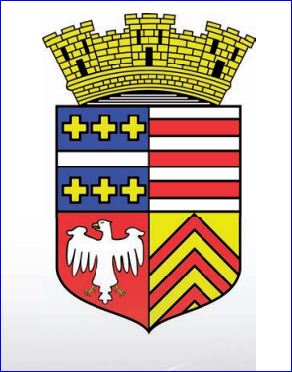 (1959) Écartelé: au 1er d'azur à la divise d'argent accompagnée de six croisettes d'or rangées trois en chef et trois en pointe, au 2e d'argent à trois fasces de gueules, au 3e de gueules à l'aigle d'argent, becquée et membrée d'or, au 4e d'or à trois chevrons de gueules.