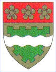(1960) De sinople à la bordure crénelée d'or, à la fasce ondée d'argent brochant sur le tout; au chef de gueules chargé de trois fleurs à cinq pétales d'or.