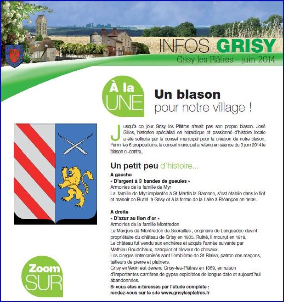 (2014) Parti: au 1er d'argent à trois bandes de gueules, au 2e d'azur au lion d'or surmonté de deux cierges d'argent passés en sautoir.