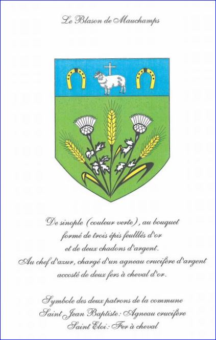De sinople au bouquet de trois épis de blé tigés et feuillés d'or et de deux chardons tigés et feuillés d'argent; au chef cousu d'azur chargé d'un agneau pascal d'argent accosté de deux fers à cheval d'or.