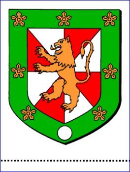 Gironné d'argent et de gueules au lion d'or lampassé de gueules brochant sur le tout; à la bordure de sinople chargée de sept quintefeuilles d'or et d'un besant d'argent en pointe.
