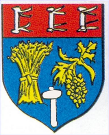 D'azur à la gerbe de blé à dextre et à la grappe de raisin tigée et feuillée à senestre, le tout d'or, soutenues d'une masse de carrier d'argent; au chef cousu de gueules chargé de trois accouples d'argent.