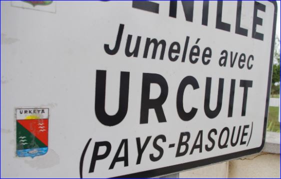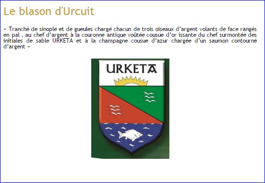 (1976) Tranché de sinople et de gueules chargé chacun de trois oiseaux d'argent volant de face et rangés en pal; à la champagne d'azur chargée de vaguelettes d'argent et d'un saumon contourné du même; au chef d'argent à la couronne antique voûtée d'or mouvant du trait du chef et surmontée de l'inscription de sable « URKETA ».