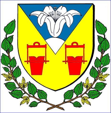 (2015) Mi-tranché, retaillé en chef: au 1er d'azur au bouton de bâton de prieur d'argent orné d'une fleur de lis de jardin du même mouvant de la partition, au 2e d'or à deux creusets de fonderie de gueules.