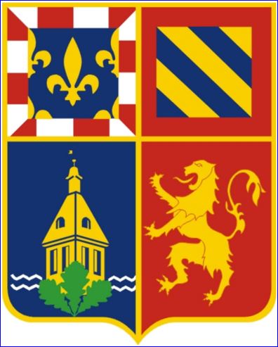 Parti: au 1er d'azur à la jumelle vivrée et abaissée d'argent, au donjon du château du lieu alésé d'or, ajouré du champ, brochant, à trois feuilles de chêne de sinople posées en pal bande et barre,les tiges passées en sautoir en pointe surbrochant le tout, au 2e de gueules au lion d'or; le tout sommé d'un chef parti au 1er d'azur semé de fleurs de lis d'or à la bordure componée d'argent et de gueules, au 2e bandé d'or et d'azur à la bordure de gueules.