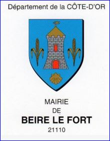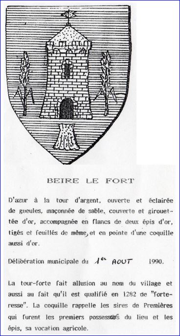 (1990) D'azur à la tour d'argent, couverte et girouettée d'or, maçonnée de sable, ouverte et ajourée de gueules, accompagnée en flancs de deux épis de blé tigés et feuillés d'or et en pointe d'une coquille du même.