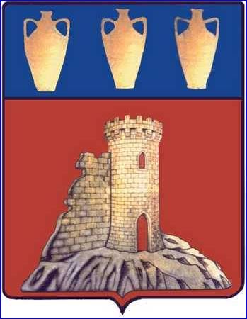 De gueules à la tour d'or avec son avant-mur dextre ruiné, le tout maçonné de sable, ouvert et ajouré du champ, posé sur un rocher d'argent mouvant de la pointe; au chef cousu d'azur chargé de trois amphores d'or.