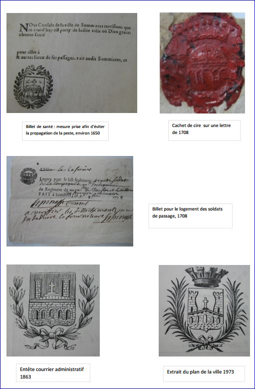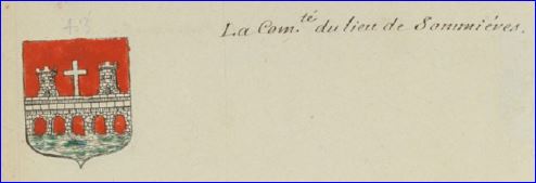 (1696) De gueules au pont de cinq arches d'argent posé sur des ondes du même mouvant de la pointe, maçonné de sable et sommé d'une croisette latine d'argent accostée de deux tours du même ouvertes, ajourées et maçonnées de sable.