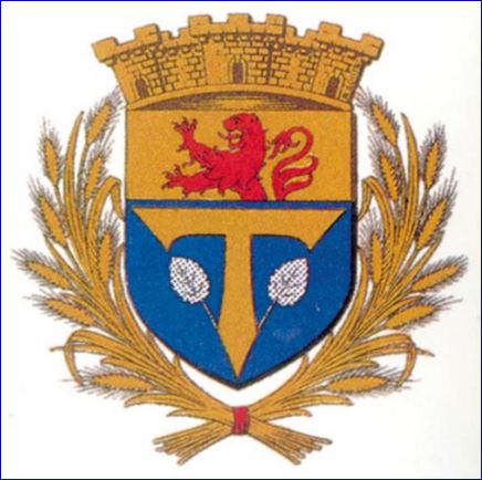 D'azur au tau d'or accosté de deux feuilles de tremble d'argent posées l'une en bande et l'autre en barre et mouvant du pied du tau; au chef d'or chargé d'un lion issant de gueules.