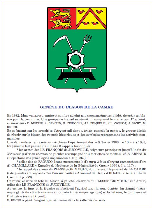 (1983) De sinople à la faux passée en sautoir avec une fourche du même, à la roue dentée d'argent remplie du champ brochant en coeur et à la balance de sable, les plateaux d'argent brochant en pointe; au chef parti: au 1er de gueules à deux léopards d'or l'un au-dessus de l'autre au 2e d'or au chevron de gueules accompagné de quatre merlettes du même.