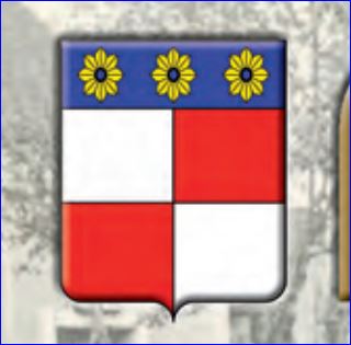 Écartelé d'argent et de gueules; au chef d'azur chargé de trois fleurs à huit pétales d'or boutonnées d'azur.