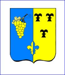 Parti: au 1er d'azur à la grappe de raisin tigée et feuillée d'or en chef, au 2e d'or à trois rocs d'échiquier de sable, 2 et 1 en chef; à la fleur de lis brochant en pointe sur le parti, de l'un en l'autre.