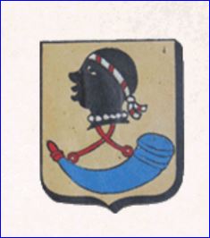 D'or à la tête de Maure de sable tortillée d'argent bandé de gueules, le cou ceint d'un collier de perles d'argent, à laquelle est appendu un cor de chasse d'azur, embouché, bouclé et lié de gueules.
