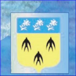 D'or à trois martinets de sable volant en pal; au chef d'azur chargé de trois lis de jardin d'argent.