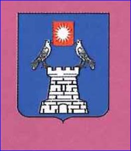 D'azur à la tour ronde d'argent, maçonnée de sable, sommée de deux colombes affrontées d'argent soutenant de leurs becs un écusson de gueules à l'étoile de seize rais d'argent.