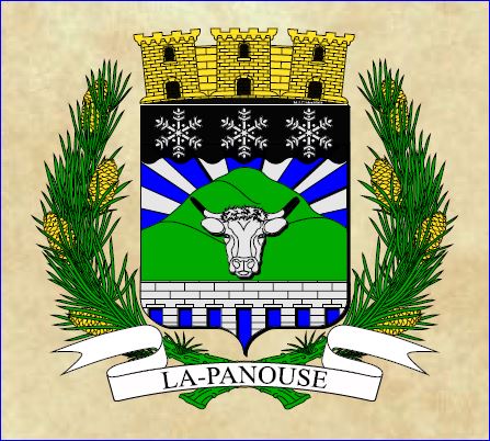 (2015) Coupé: au 1er d'azur à six émanches appointées en pointe d'argent, au 2e d'azur au passerelle d'argent, maçonné de sable, à sept arches rectangulaires, mouvant de la pointe et des flancs; au mont de sinople, mouvant du pont et des flancs, brochant sur la partition, chargé d'un rencontre de boeuf Aubrac d'argent; au chef ondé de sable, chargé de trois cristaux de neige d'argent.