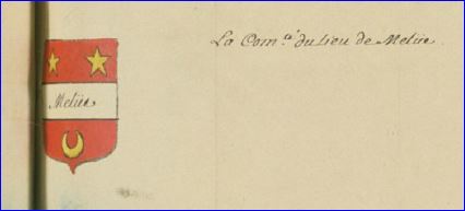 De gueules à la fasce d'argent chargée de l'inscription « MELVE » de sable, accompagné en chef de deux étoiles d'or et en pointe d'un croissant du même.