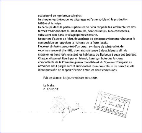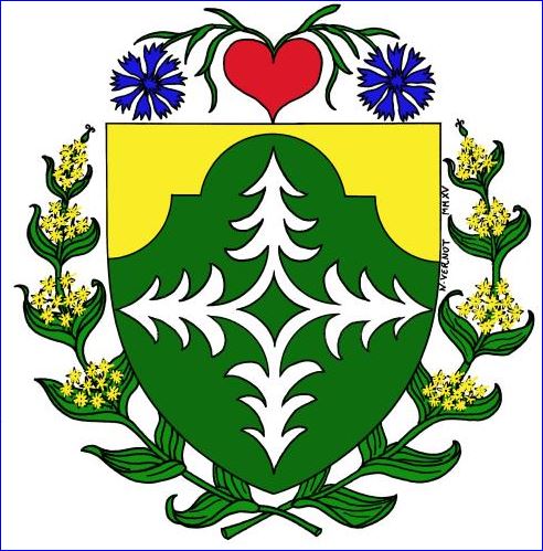 (2015) De sinople à quatre sapins posés en croix, chaque fût uni à l'angle d'un carreau posé en losange, ployé et vidé, le tout d'argent ; au chef voûté dans son tiers central et soutenu par deux quarts de besant unis au chef et accolés aux flancs, le tout d'or.