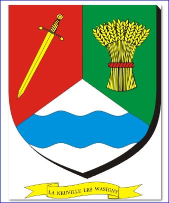 (2015) Tiercé en pairle renversé: au 1er de gueules à l'épée renversée d'or posée en barre, au 2e de sinople à la gerbe de blé d'or liée de gueules, au 3e d'argent à la fasce ondée d'azur.